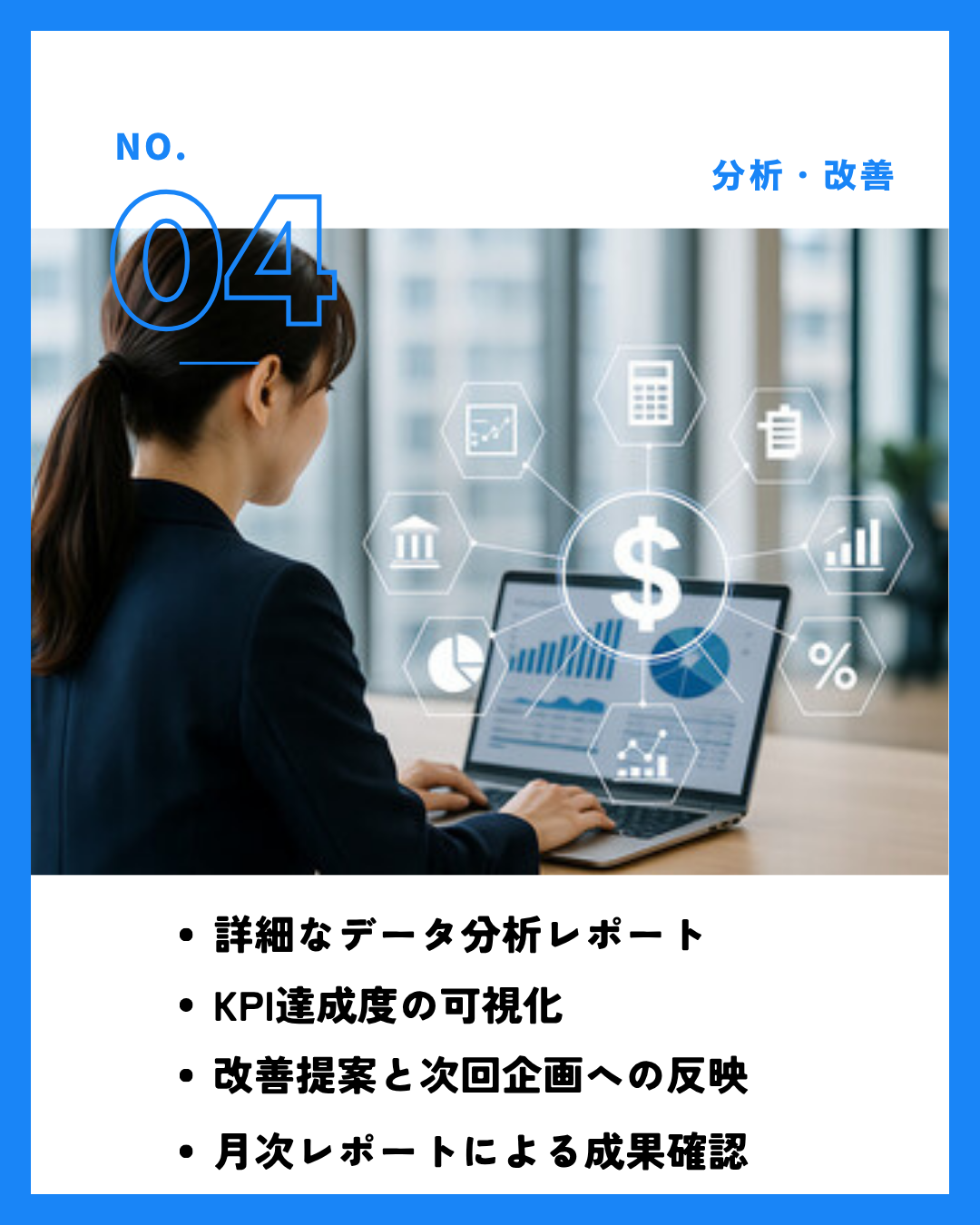 分析・改善 | ○ 毎月レポート | △ 3ヶ月に1回 | △ 半年に1回 | × 自分で |